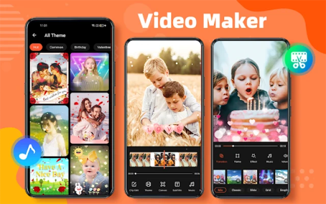 Video Maker With Music & Photo is an easy-to-use, full-featured free HD video editor and video maker with photos, background music, magic effects, stylish templates, Animated Video Editor, text, audio, transition effects, animated stickers, blur background and more. Just simply select your photos and videos to make HD videos without watermark, festival video status, anniversary photo status, birthdays, weddings, Valentine's Day, Thanksgiving Day, Christmas Eve and other precious moments for YouTube, Instagram, TikTok, WhatsApp, and Facebook.