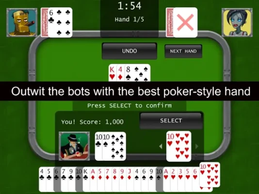 Pick’Em Puzzle® is played directly against 2 to 4 bots. It is an interesting twist on no-betting, all-skill UnPoker where cards are dealt to the players based on player card selection rather than randomly like poker, so that mental skill has replaced chance. Pick’Em Puzzle® is a puzzle game as explained below.