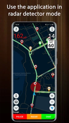 The main advantages of the application "Police Detector": * Absolutely free * No registration needed * Displays high-speed cameras and police patrols (if they are marked by other users) * Displays traffic jams * Works in Radar Detector mode * Shows speed limits on road sections near high-speed cameras and police patrols (if speed limits are introduced by users)