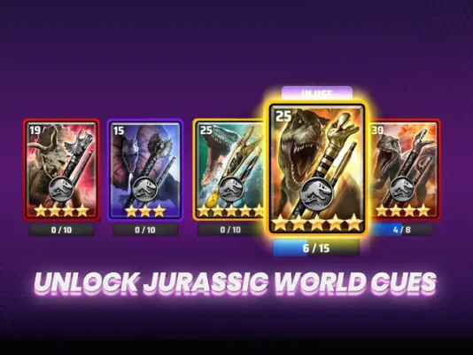 For a limited time, collect five exclusive virtual cues inspired by fan-favorite dinosaurs from the Jurassic World franchise: Dilophosaurus, Velociraptor, Triceratops, Mosasaurus, and the Tyrannosaurus Rex. Each cue features a distinct visual design and gameplay-enhancing attributes as well as brand-new victory animations that echo the thrill of Jurassic World and roar to life when you win!