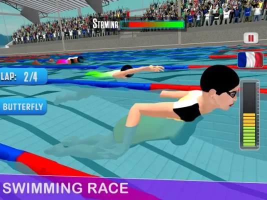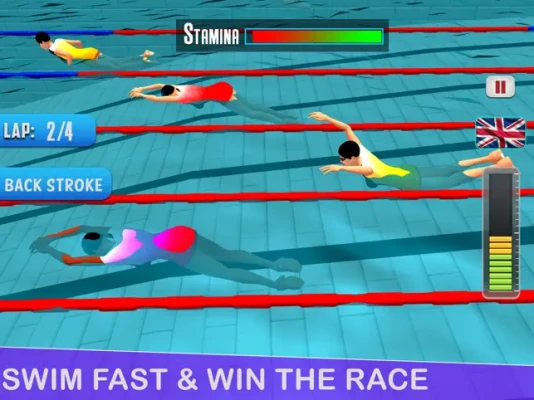 Dive into the beautiful swimming pool, practice in free style and compete with professional swimmers in this swim racing games. Keep Diving into the water pool and keep flipping or taping to attain faster speeds. Free Style swimming is best but you can try other professional swimming styles like backstroke, breaststroke,butterfly store, sidestroke all. Practice these stores, chose your favorite swimming team and beat other swimming racing while flipping all through the water.