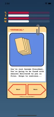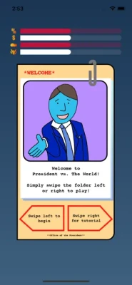 President The Game is a choice based game where you swipe left or right to make decisions as the President. The choices that you make affect 4 meters: Popularity, Economy, Security, and Authority. Try to make it to the end of your presidency without any of the meters reaching zero. Good luck! The fate of our nation is in your hands. No pressure though!