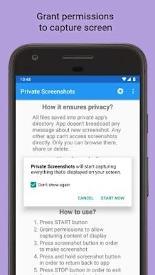 All files are saved into hidden directory. The app doesn't broadcast any message about new screenshot. Any other app can't access screenshots directly. Only you can browse them, share or delete.