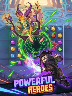 Set up the ultimate defense team. Raid other players in versus battles around the world. Steal their trophies by defeating their defending heroes in turn based puzzle battles! Climb to the top of the arena and collect legendary heroes.