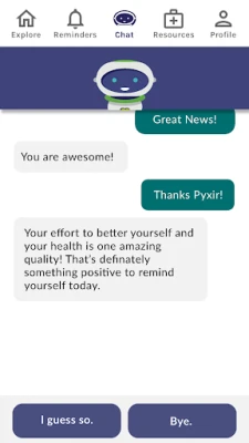 Pyxir is the Pyx Health Intelligent Robot! This friendly, caring chatbot character will check in with you regularly and is available 24/7 to offer insights, humor, practical techniques, and uplifting support whenever you want to chat.
