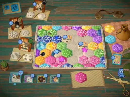 Quilts and Cats of Calico is a cozy board game in which the player's main task is to make a quilt from patterned fabric scraps. By smartly combining the colors and patterns of the scraps, the player can not only score points for the completed design but also sew on buttons and attract adorable cats, who have their own preferences for bedding patterns.