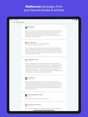 Quickly synchronize your highlights from Kindle, Apple Books, Instapaper, Pocket, Medium, Goodreads, and even paper books. Then start building a daily review habit using the app and daily email. By reviewing your highlights every day, you'll retain dramatically more and you'll finally stop forgetting all the details from books you just finished!