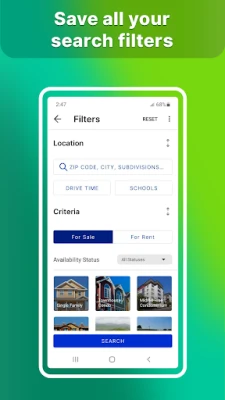 • Filter search criteria by what’s important to you, including proximity, price, square footage and more.