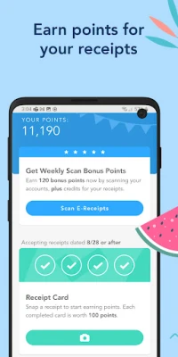 Snap a photo in the Receipts tab to submit your paper receipts. 4 valid receipts fill up one green Point Card.
