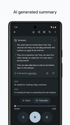 Recorder brings new powers to meetings, lectures, band practices, family memories – anything that you want to capture. Recorder automatically transcribes and labels what you record so that you can easily find the parts that matter to you. Save, edit, share, listen to later, or even summarize. Available on Wear OS with a dedicated watch face tile to quickly capture moments and thoughts on your phone or Pixel Watch.
