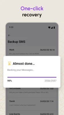 Another powerful feature is to backup your SMS conversations! The Backup and Recover Messages tool will create a small backup file containing all your existing conversations, contacts numbers, and received data and store it in your storage! It's an easy process, click on the backup button, and the SMS Backup and Restore app will auto-backup your SMS messages! After that, you will be able to perform a message recovery with just a few taps.
