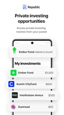 The Republic Android application (the “App”) is an extension of the Republic Site which is owned and maintained by OpenDeal Inc., which is not a registered broker-dealer, funding portal or investment advisor. OpenDeal Inc. does not give investment advice, endorsement, analysis or recommendations with respect to any securities. All securities listed here are being offered by, and all information included on this Site is the responsibility of, the applicable issuer of such securities. The intermediary facilitating the offering will be identified in such offering’s documentation. The App is subject to the same terms and privacy policy unless otherwise noted therein. The App is currently only accessible to registered users of Republic; if you wish to use Republic without registering an account please visit the Site, republic.com. The use of a promo code is subject to the promo code terms and conditions and is not guaranteed. Investments in private companies are particularly risky and may result in total loss of invested capital. Past performance of a security or a company does not guarantee future results or returns. Only investors who understand the risks of early stage investment and who meet the Republic's investment criteria may invest. No member of the Republic ecosystem verifies information provided by third-party companies on the Site and through the App and make no assurance as to the completeness or accuracy of any such information. Additional information about certain companies fundraising can be found by searching the EDGAR database, or the offering documentation provided when the offering does not require an EDGAR filing.