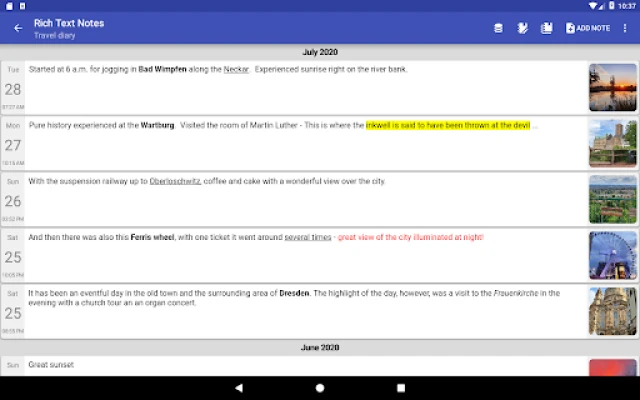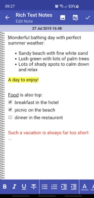 Rich Text Notes can be used as a simple notebook, but also as a diary, shopping list or todo list, for example. As a special feature, our app offers the option of creating your notes with formatting, not just plain text. Rich Text Edit also allows you to keep as many different notebooks as you want. With this app you can easily record and organize all your notes, activities, events, appointments, experiences, ideas, flashes of genius and little secrets throughout the day.