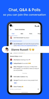 Interact with other attendees via live chat messages, polls, private video meetings and even group meetings.