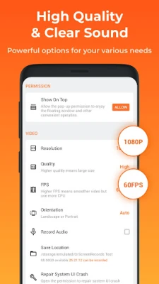 Screen Video Recorder - XRecorder supports recording game screen in the highest quality, 1080p, 12Mbps, 60FPS. Of course, you can record screen with adjustable resolution(240p to 1080p), quality, and FPS(15FPS to 60FPS).