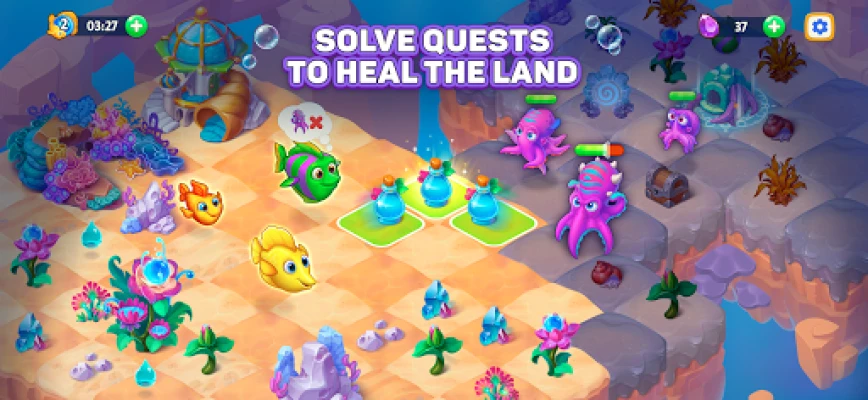 Turn an empty seabed into magic ocean paradise! Make an adventure to the fish kingdom to save it from evil octopus and restore the world of fantastic aquatic creatures. Discover the mysteries of the abyss, complete brainteasers and see the life of marine animals with your own eyes! Create your own underwater world in the match game!
