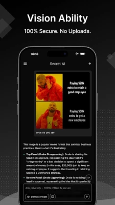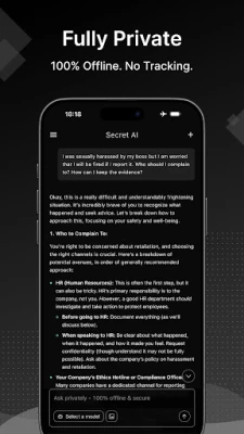 Experience private offline AI chat with no internet connection required. Secret AI is a secure private LLM chatbot and local AI assistant that runs entirely on your device - your conversations stay 100% private with zero data collection, no servers, no account required, no tracking, and completely anonymous.