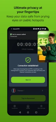 - Stay private on public Wi-Fi hotspots and protect your data from prying eyes on free public Wi-Fi, in places like shopping malls, airports, hotels, cafes, restaurants, and more.