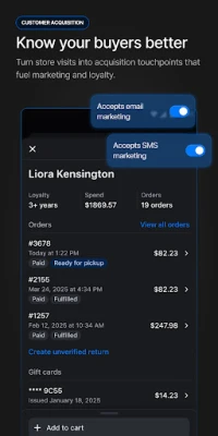 • Create fully-synced customer profiles so staff can give every customer a personal shopping experience with quick access to notes, lifetime spend, and order history