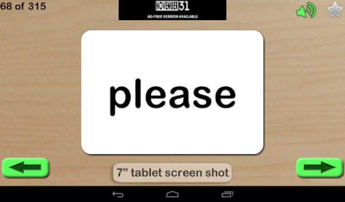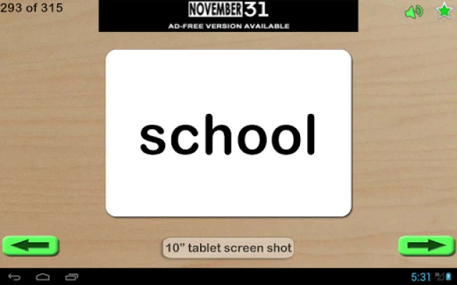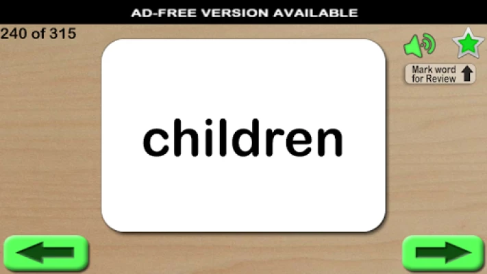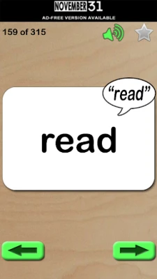 Features included: • Words can be marked to the Review list (use the star to mark and menu to clear list) • The word is read out when the card is touched • Long press buttons to jump to start or end
