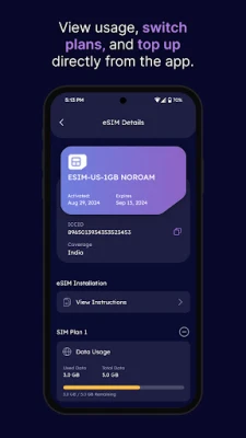 Track your eSIM data profile, top up with one tap, and control everything via the eSIM app.