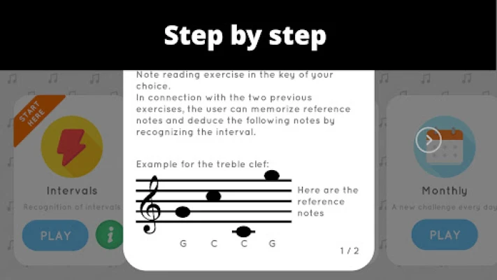 o Smart mode: let yourself be guided with our complete learning program available in four different clefs (bass clef, treble clef, alto clef and tenor clef). Ideal for beginners, learning begins with three notes and offers progressive difficulty that adapts to the player's progress. So move forward at your own pace.