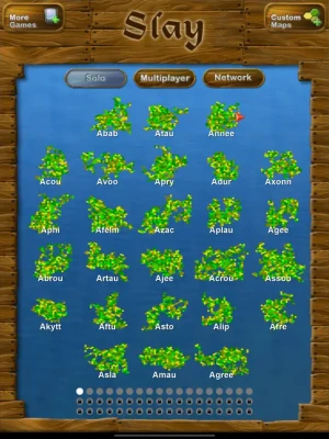Slay is a simple to learn game of strategy and cunning set in medieval times. The island is divided up between the six players, and you must try to capture your enemies' land and link up your own territories to create larger and stronger ones. You begin capturing land by attacking with your peasants. Once your territories become richer you can combine peasants to make stronger and stronger people (Spearmen, Knights and then Barons) who can kill weaker enemy troops, or knock down their castles. Just be careful that you don't create too many expensive men or the territory will go bankrupt!