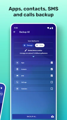 Text messages, Apps, Contacts, SMS, Call Logs, and Calendars to your Storage and Drive.