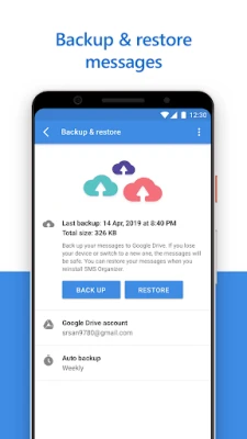 Back up your messages to Google Drive. If you lose your phone, switch to a new one or even format it, your messages will be safe. Restore your messages when you reinstall SMS Organizer.