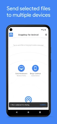 This app interacts with https://pairdrop.net/ to be able to discover other devices running PairDrop in your local network. However, none of your files is ever sent to any server but are transferred directly peer-to-peer between your devices.