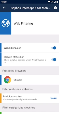• When you turn on Web Filtering, the app uses the Android Accessibility Service API to check links you open in supported web browsers. The app sends link addresses to SophosLabs to check for malicious, undesirable, or illegal content. Depending on the app settings, such content is blocked. No personal information is collected.