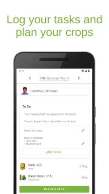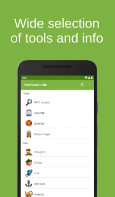· Villager Locator to locate every NPC in the map. · Calendar and Crop Planner: create a task list and plan your crops. · See festivals and birthdays with the calendar. · Keep track of the Community Center bundles. · Listen to the full soundtrack of Stardew Valley. · Get info about the villagers (Loved gifts, birthday...) · Get information about the crops, fish and animals. · Learn where you can find all the artifacts and keep track of the completed ones.
