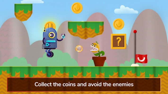 Play and learn as you unlock levels and incorporate new elements to develop your logical thinking while collecting coins, opening chests and avoiding being caught by your enemies: jump on top of the turtle, make sure that the carnivorous plant doesn't appear and dodge the projectiles as you advance towards the flag.
