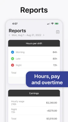 Create reports for earnings, hours per shifts, overtime and shift counting (e.g. vacation days).
