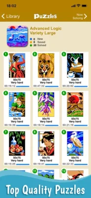 To help see the puzzle progress, graphic previews in the puzzle list show the progress of all puzzles in a volume as they are being solved. A Gallery view option provides these previews in a larger format.