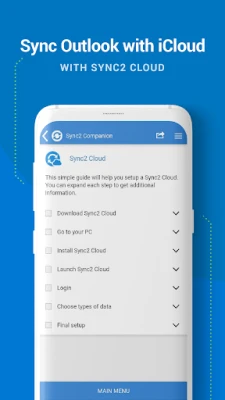 This is a Complimentary Companion that helps you set up synchronization for Outlook with Google, Office 365, Exchange, iCloud and Android, iPhone, iPad sync with iCloud and other cloud services. Sync2 Companion will go through all the necessary settings to set up synchronization.