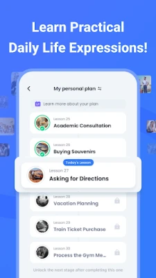Preview key vocabulary and phrases through gamified exercises like fill-in-the-blanks, shadowing, and script dialogues before each lesson.