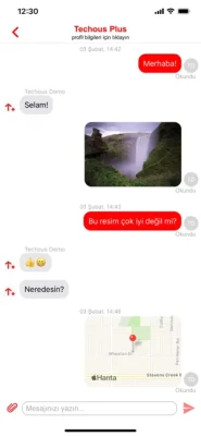 Çeşitli Şekilde Mesajlaşma Techous Messenger’ı kullanarak arkadaşlarınızla çeşitli şekilde mesajlaşabilirsiniz. Normal yazılı mesajlar dışında arkadaşlarınıza fotoğraf, video, sesli mesaj ve konumunuzu gönderebilirsiniz.