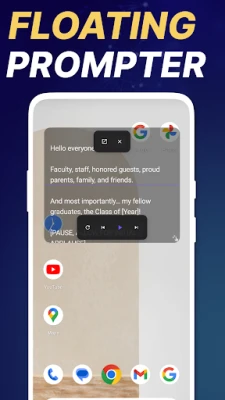 Record directly with your favorite camera app! Our smart prompter overlay floats on top of any app (Instagram, TikTok, Facebook, your phone's native camera). You can position the widget anywhere and resize it for maximum comfort. This is the ultimate floating script reader!