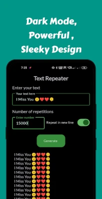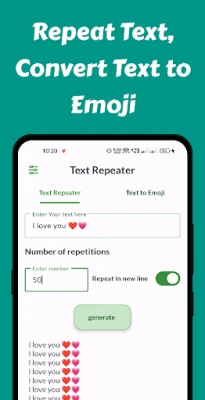 Text Repeater is your go-to app for quickly and easily repeating any text up to 15,000 times. Whether you're looking to create fun text patterns, send repeated messages, or just want to save time typing, Text Repeater makes it simple and efficient.