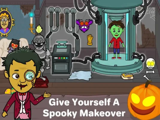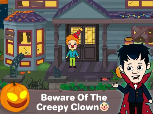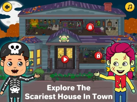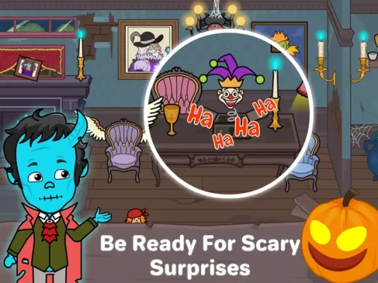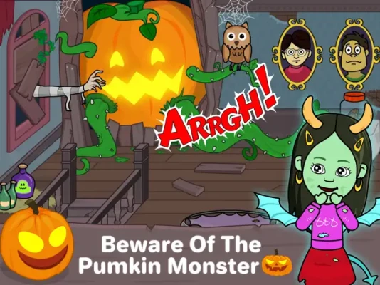 This scary mansion in my Tizi town has ghost games and activities. The spooky pumpkins are keeping an eye on you. Play with the scary dolls, vampires, and witches in this horror home.