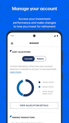 Manage your account: Access your account balance, investment performance, and make changes to how much you save and how you invest for retirement. Please note: Some services and features may not be available on certain plans.
