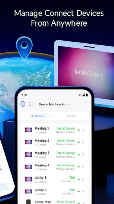 With UniFi Connect, you can: - Discover, adopt, configure, and monitor devices from anywhere. - Apply custom scene settings to multiple devices and groups with a single tap.