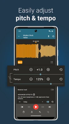 A music editor, audio speed changer and pitch shifting app designed by musicians. With Up Tempo you can easily change the playback speed and pitch of audio files on your Android device either independently or at the same time. Useful for practicing fast songs, or those that need different tunings. Up Tempo can also be used as a music looper and audio editor, for changing the talking speed on voice notes and podcasts, or for making nightcore.