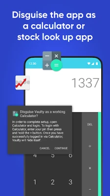 Disguise Vaulty as a fully functional calculator for a pin password or stocks lookup app for text password.