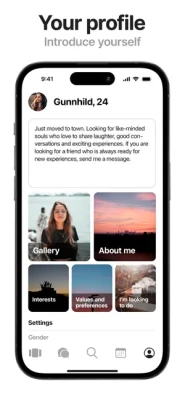 · Swipe to explore profiles · Swipe down to remove · Send messages · Show your image gallery · Match with others based on your interests