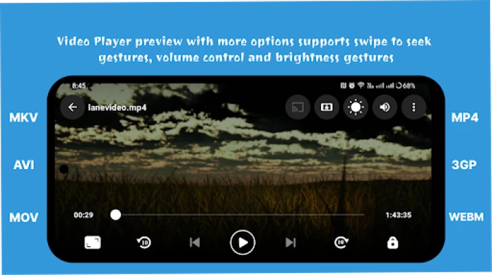 ● Video player support to video formats like MP4, 3GP, MKV, etc.