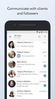 VK Admin is an app for community managers. This app allows you to communicate with clients and followers on behalf of your VK communities, manage your groups and track statistics from your mobile phone.