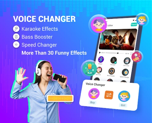 - Create funny, trending videos with interesting voice effects to share voice over on social media.