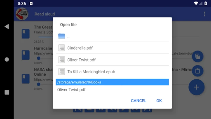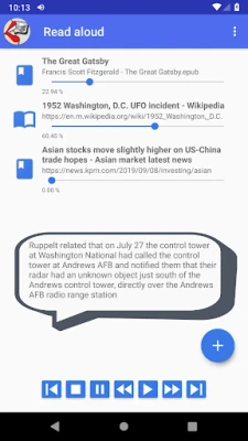 Simply share a URL from your browser, paste text from the clipboard, or open a file directly in the app. It supports various e-book and document formats like PDF, EPUB, TXT, HTML, RTF, ODT, DOC, DOCX, FB2. With added support for RSS feeds, you can now listen to your favorite blogs and news sites on the go.